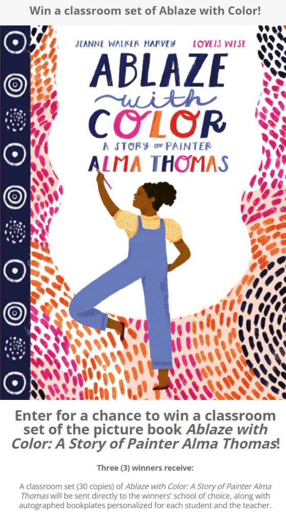 ENTER HERE for a chance to win a classroom set of the picture book Ablaze with Color: A Story of Painter Alma Thomas!